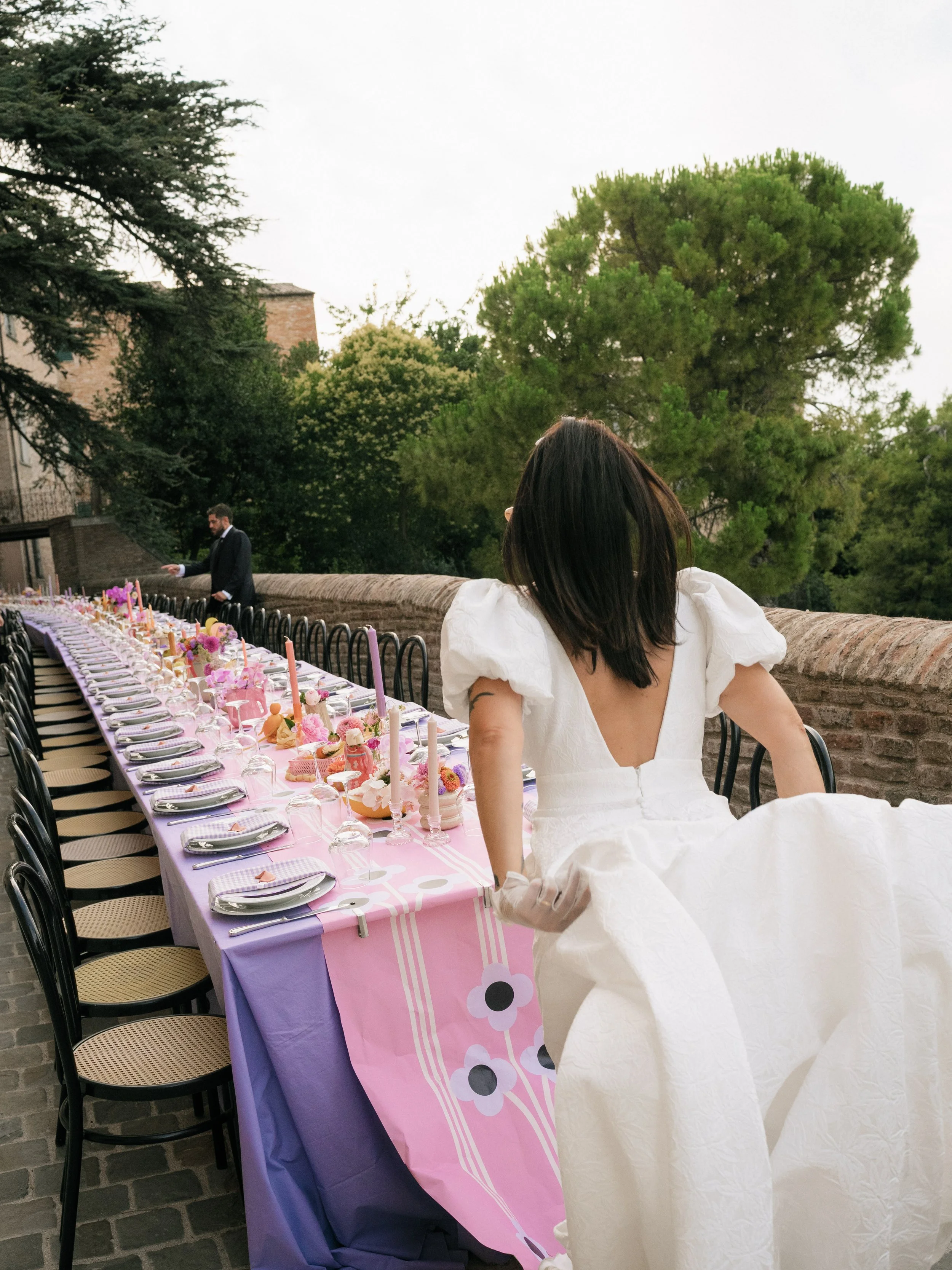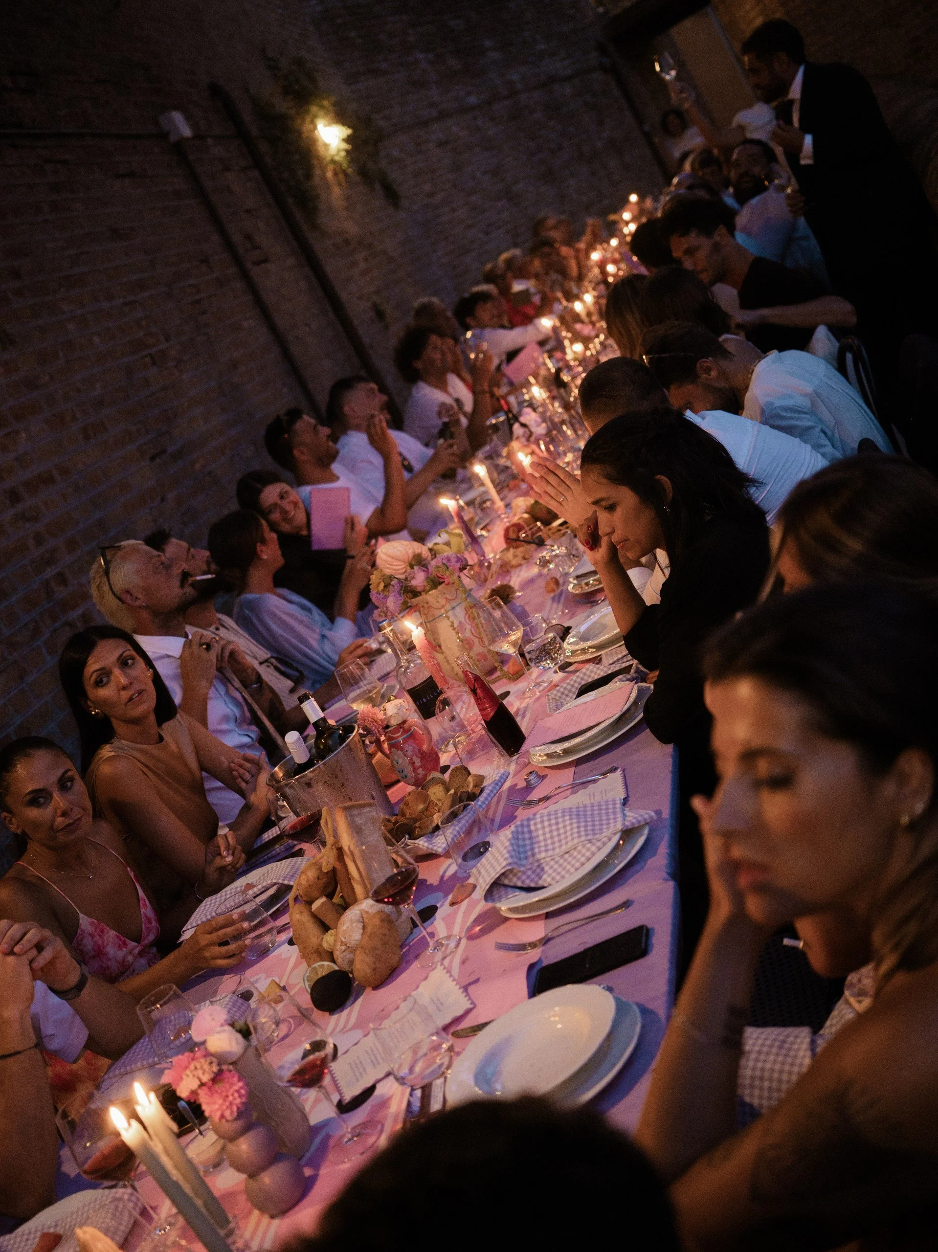 The symbolic return home took place at the reception table: a large, communal table that brought everyone together, much like a traditional Sunday lunch.