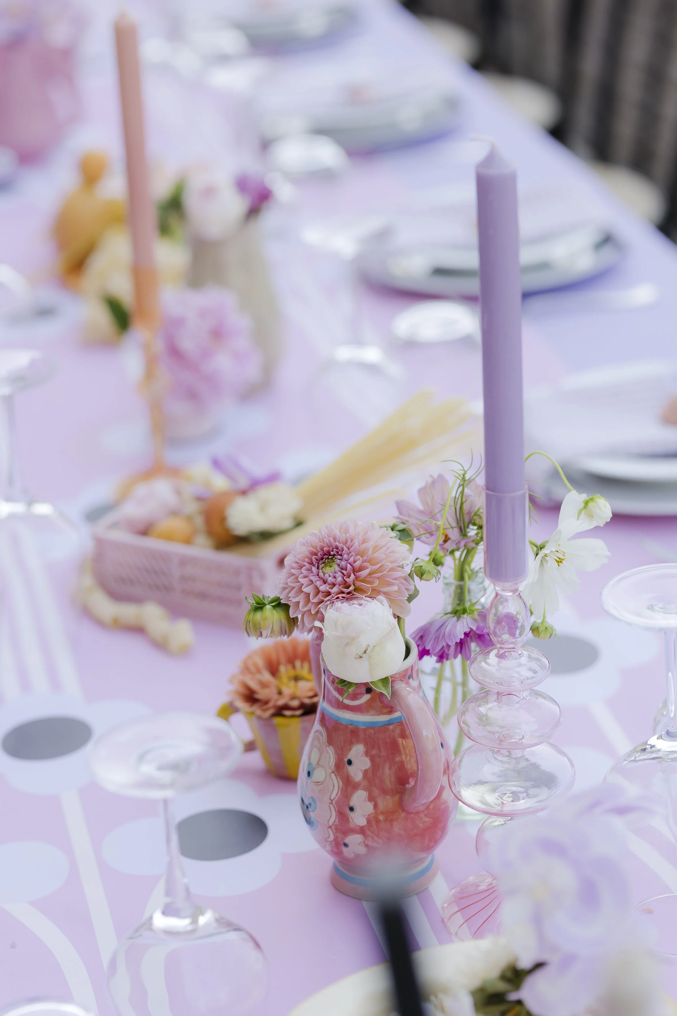 Dishes were served in the center of the table, and the setup was lively and colorful, with creative compositions of fruit, flowers, and dried pasta.