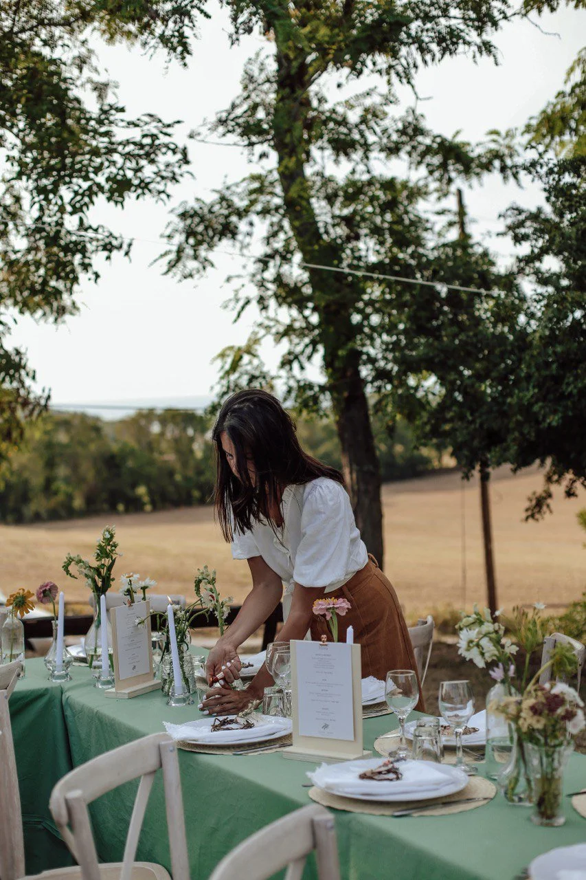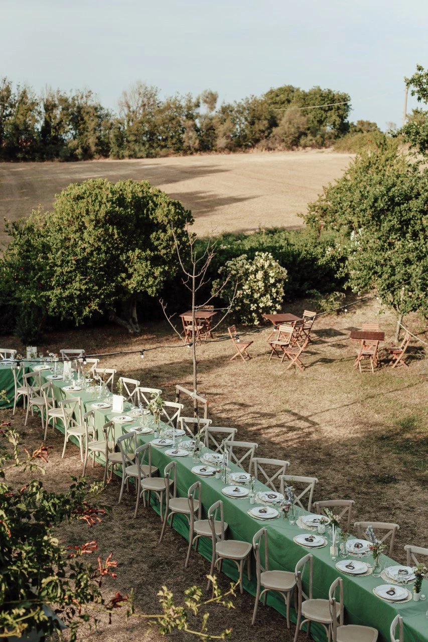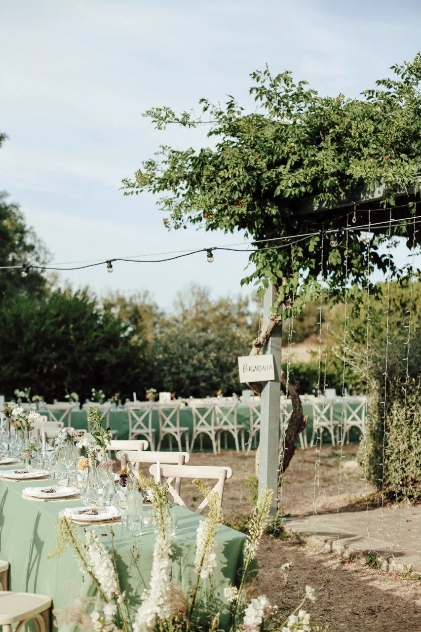 Il ricevimento è in un casolare di campagna e l’allestimento della cena si sviluppa in un tavolo imperiale a forma di ferro di cavallo, con tessuti verdi e un’ estrema ricerca dei dettagli, il segnaposto è una ghirlandina artigianale realizzata con salice intrecciato e fiori essiccati.