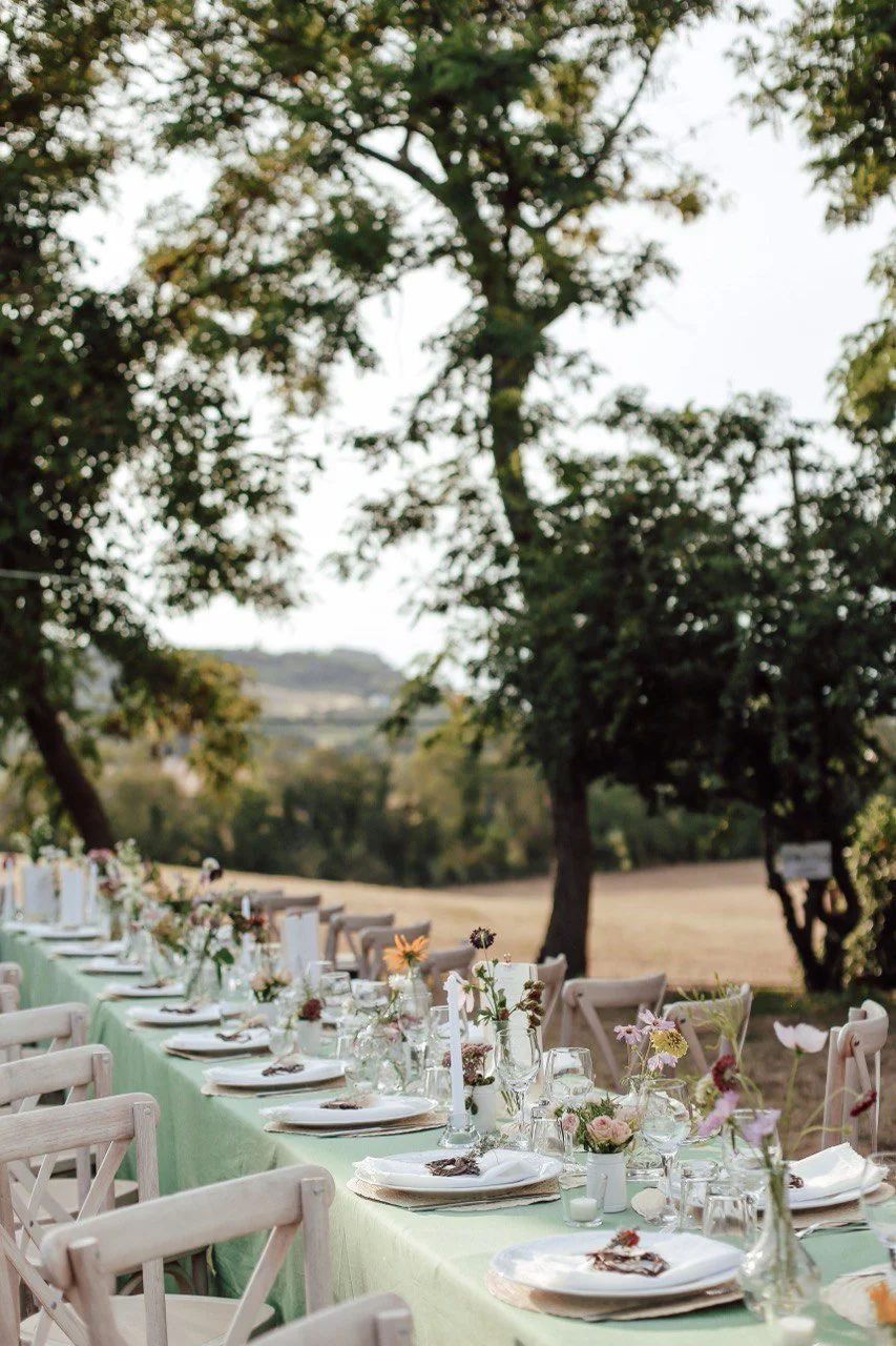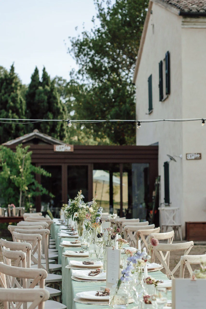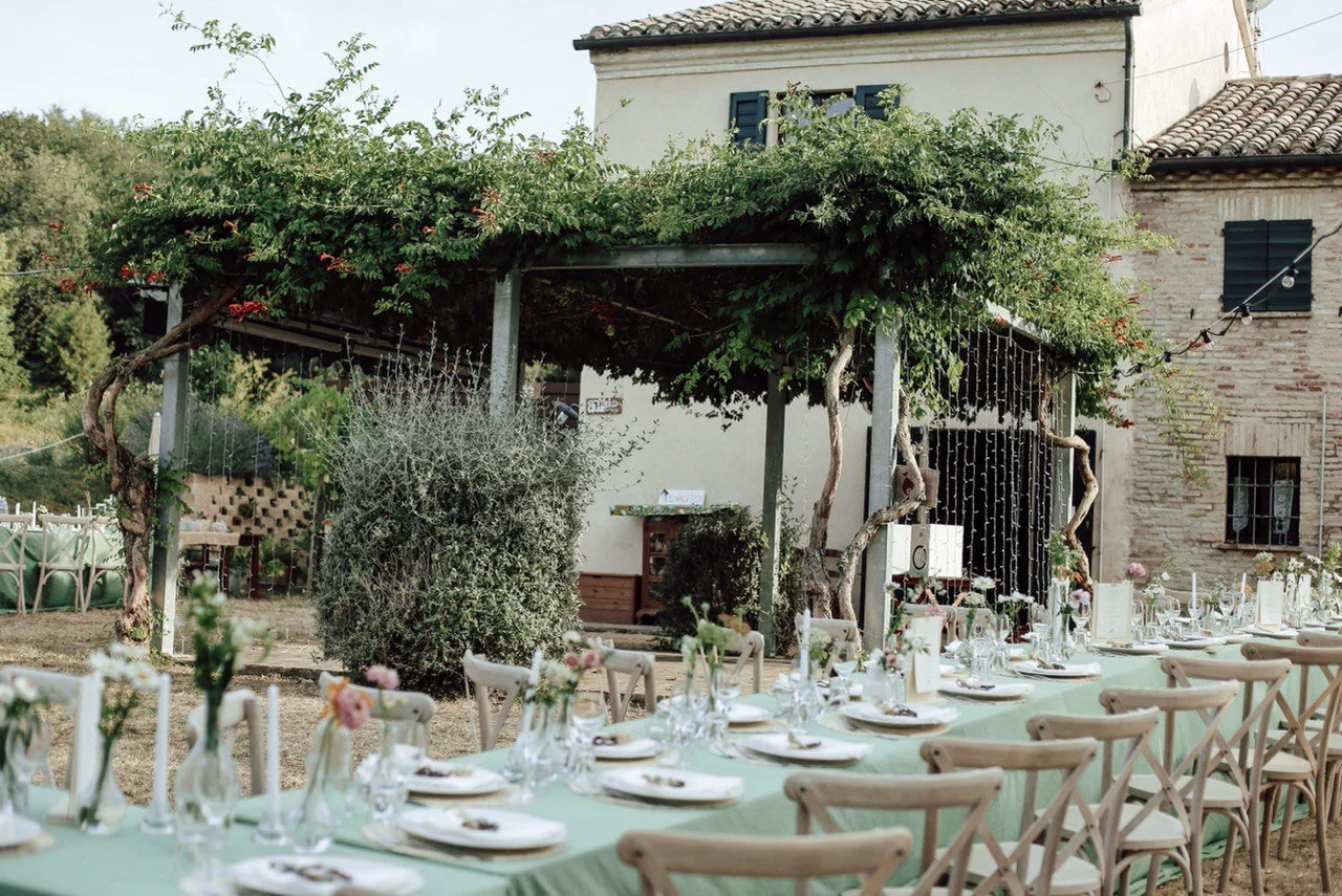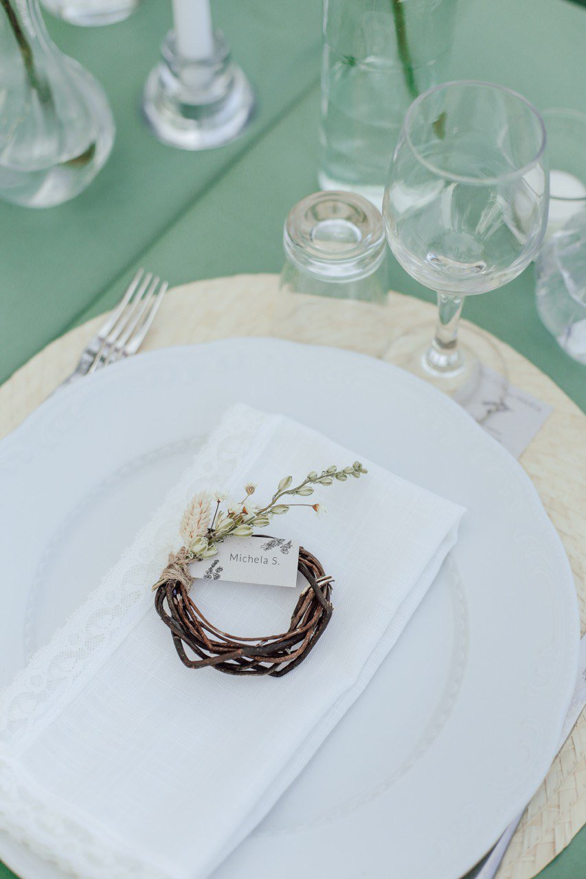 Il ricevimento è in un casolare di campagna e l’allestimento della cena si sviluppa in un tavolo imperiale a forma di ferro di cavallo, con tessuti verdi e un’ estrema ricerca dei dettagli, il segnaposto è una ghirlandina artigianale realizzata con salice intrecciato e fiori essiccati.