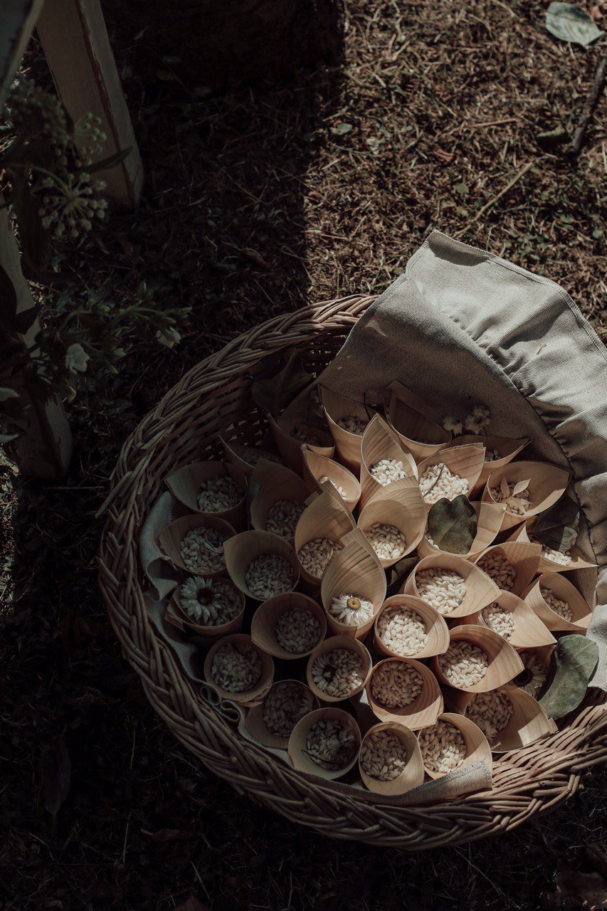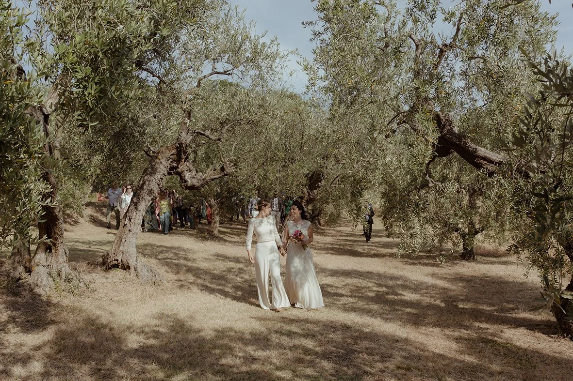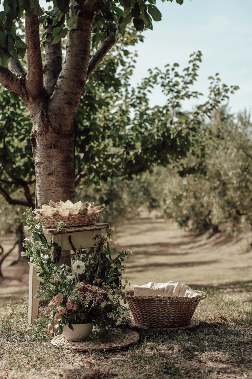 Le spose scendono insieme, mano nella mano, tappeti in rattan e ceste in vimini piene di fiori di campo delimitano il camminamento.
